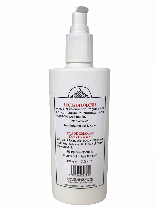E' assolutamente non tossico e non alcolico, vaporizzato direttamente su cani e gatti, lascia una delicata fragranza di cacao, senza appesantire il manto.
